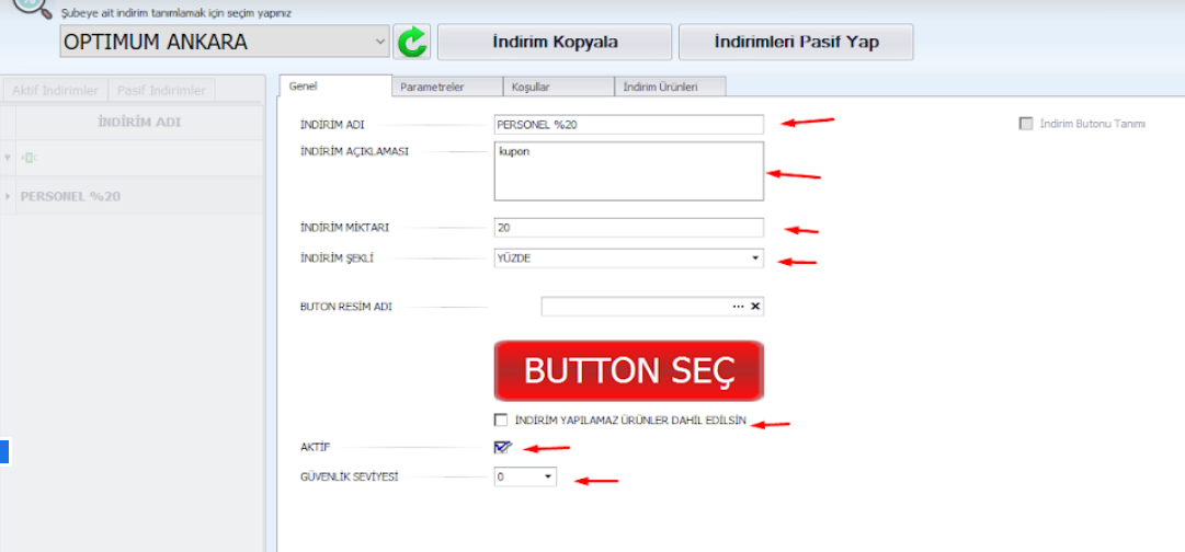 İndirim Kuponu servisi ilgili firmanın sunucusunda oluşturulup aşağıdaki resimde belirtildiği gibi Arka Ofis>Entegrasyon>İndirim Kuponu Servisi başlığının altında bulunan ayarlar doldurularak tanımlanır;İndirimin Oluşturulması