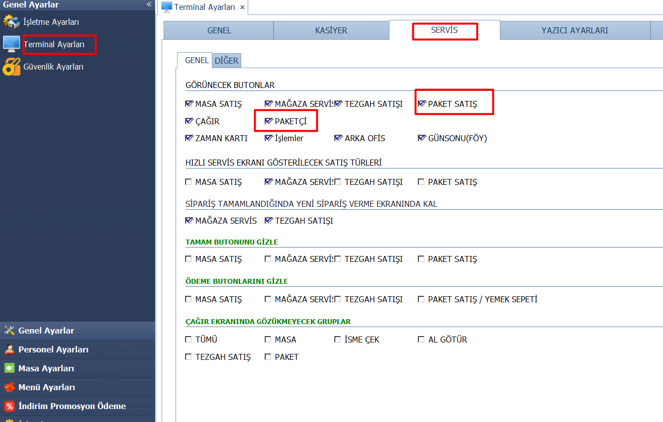 Terminal ayarları seçilir. Servis bölümüne giriş yapılır.