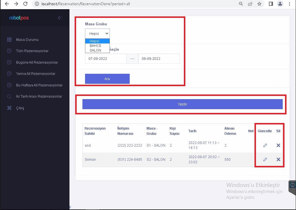 - Ek olarak açılan panel de görüntülenen Rezervasyon bilgilerini Silip, Güncelleyip veya Belirtmiş olduğunuz Tarih Aralığını Masa Grubuna göre aratarak ‘ YAZDIR ‘ butonunu kullanarak yazıcıdan çıkarabilirsiniz.